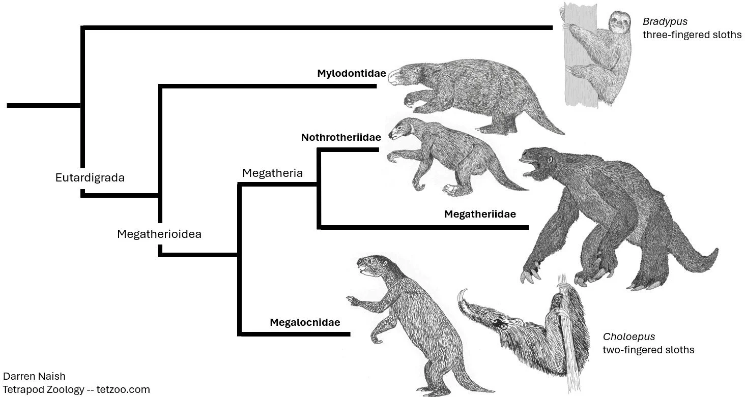 Caption: a simplified version of the morphology-based view of sloth phylogeny generally thought correct prior to the 2010s. Bradypus was regarded as the earliest diverging sloth lineage (in which case it has a suspiciously long ghost lineage), nothrotheres and megatheriids were considered close kin, and Choloepus was a megalocnid and hence part of one of the youngest sloth groups. Images: Darren Naish.