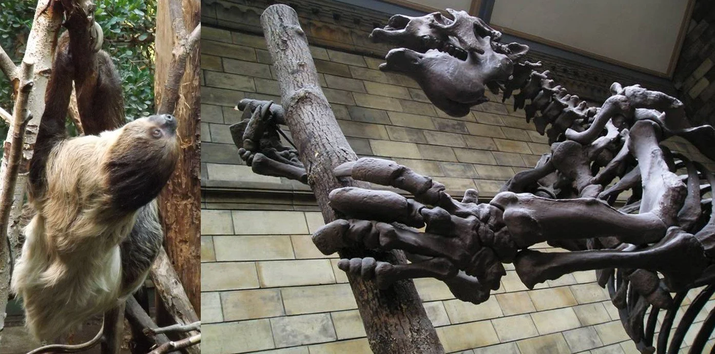 Caption: there are two very basic things to remember about sloths... that there are small, tree-climbing ones, and a substantial diversity of mostly larger or MUCH larger, extinct ones. Here are two exemplars of those facts: a captive Choloepus at left, and a museum skeleton (a cast) of the South American giant Megatherium (at the Natural History Museum, London) at right. Images: Darren Naish.